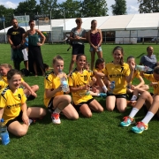 Am letzten Sonntag in den Pfingstferien trat die weibliche D1 in Hohenacker beim traditionellen Sport- und Sommerturnier ihr viertes Turnier in dieser Saison an. Bei sommerlichen Temperaturen von um die 30°C kam man mit einem 11:6 Sieg in der Vorrunde gegen die Mannschaft aus Backnang/Oppenweiler gut ins Turnier. Gegen das neu formierte Team aus Winnenden konnte man sich im zweiten Spiel ebenfalls durchsetzen (13:7). Mit einem klaren 11:1 gegen die doch körperlich unterlegenen Mädels aus Fellbach sicherte man sich Platz eins in der Gruppe. Erfreulich dabei, dass bei allen drei Vorrundenspielen die Mischung wieder gut gestimmt hatte. Auch mit dem kompletten jungen Jahrgang auf dem Feld konnte man die Zwischenstände halten bzw diese sogar ausbauen.