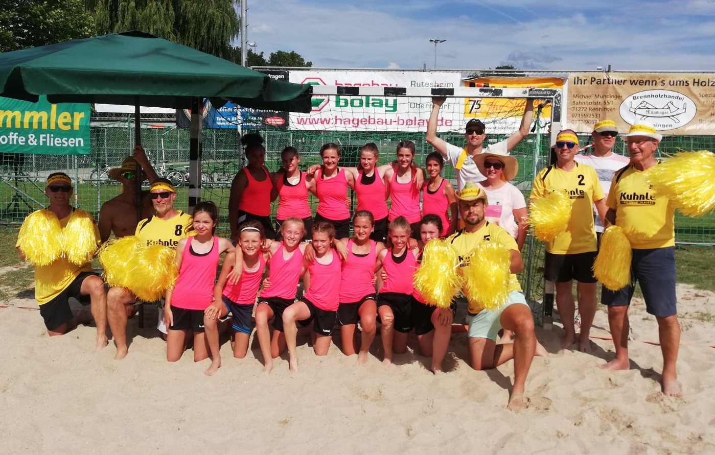 Viel Freude hatten unsere D1-Mädels beim Beachturnier in Renningen kurz vor den Sommerferien. Zum Abschluss der „Vorrunde“ stand das außergewöhnliche Turnier auf Sand ganz im Zeichen möglichst viel Spaß zu haben. Es wurden zwei Teams gebildet, einmal mit sechs und ein Team mit sieben Spielerinnen. Auf den drei Sandplätzen ging es mächtig rund, lautstark unterstützt wurden beide Teams durch unsere „SG Beach Boys“. Ein toller Abschluss der Sommerrunde… Am Ende sprang Platz 3 und 4 für die Mädels heraus.