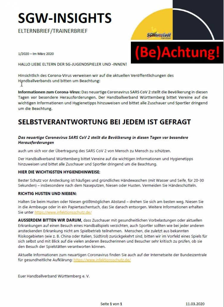 Wir folgen natürlich uneingeschränkt den Empfehlungen der Sportverbände und der Landesregierung und gemäß Beschluss des Vorstands der SG Weinstadt e.V. in der Handballabteilung der SG Weinstadt und werden neben dem Spielbetrieb auch den gesamten Trainingsbetrieb bis auf weiteres vorläufig bis einschließlich 19.04.2020 einstellen!