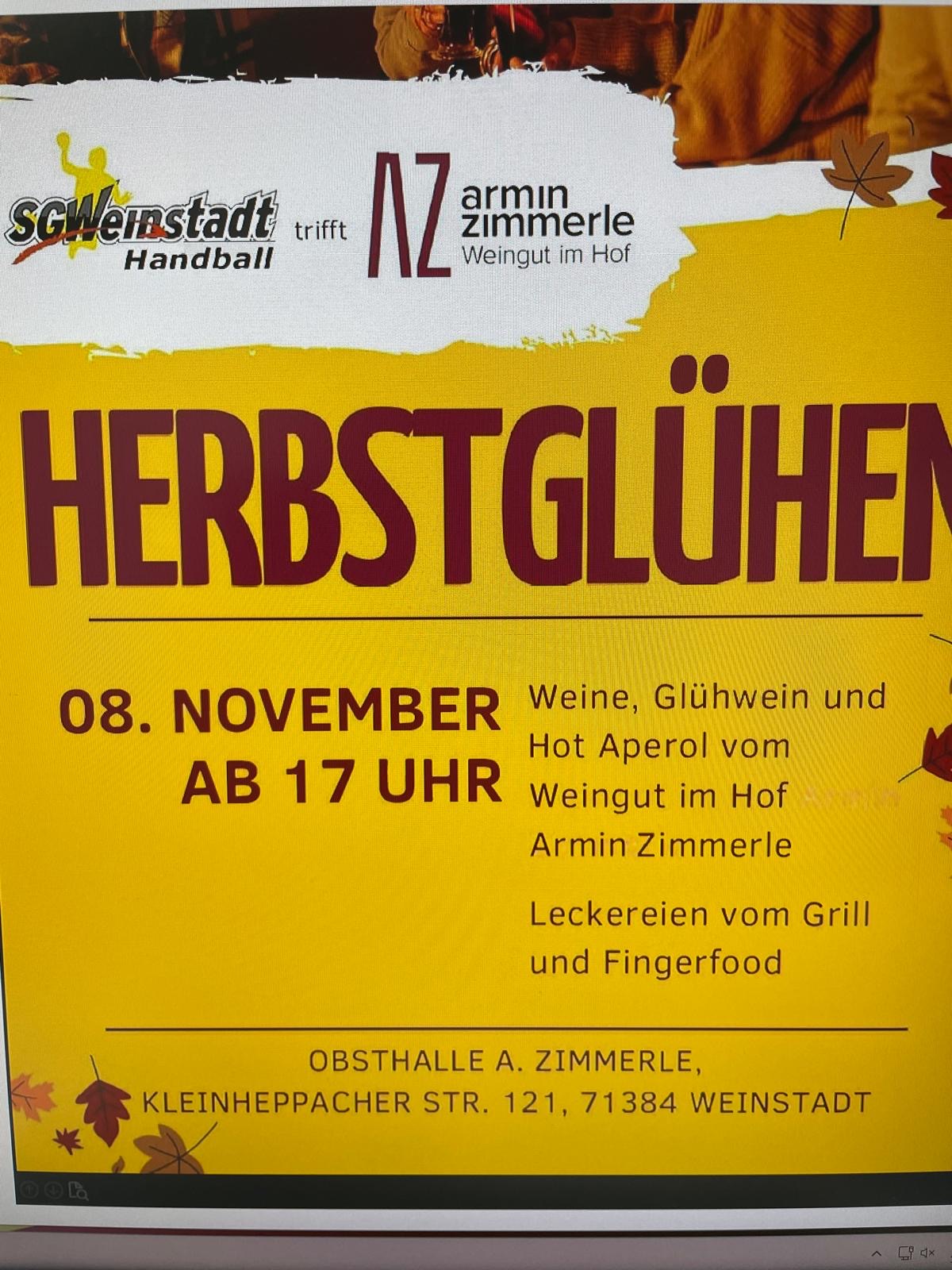 Am Samstag, den 08.11.2025, findet das erste Mal das Herbstglühen der Handballabteilung mit dem Weingut im Hof A. Zimmerle statt.